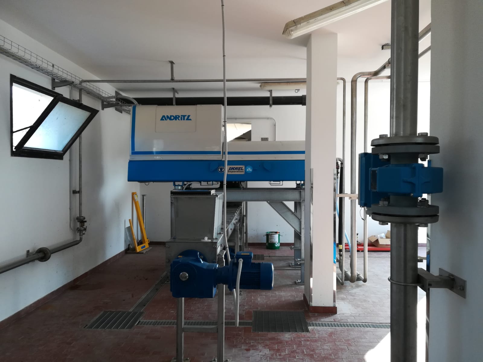 L’impianto realizzato, è costituito da un polipreparatore automatico, con due linee di dosaggio complete di pompe monovite e misuratore di portata; due linee di alimentazione fanghi con pompe monovite e misuratore di portata; Un idroestrattore centrifugo con gruppo di alimentazione/miscelazione a tre vie; Coclee di trasporto per il fango disidratato; quadro elettrico predisposto per la configurazione finale (per due idroestrattori) e completo di PLC per l’automazione, il controllo e la supervisione dei vari processi e delle varie apparecchiature installate e da installare successivamente; Impianto elettrico per l’alimentazione del comparto di disidratazione, dalla cabina elettrica dell’impianto e per il collegamento di tutte le apparecchiature installate. Inoltre, sono state realizzate le necessarie opere murarie e quelle relativo alla raccolta e allo smaltimento delle acque di scarico e di lavaggio dell’idroestrattore centrifugo e delle coclee.