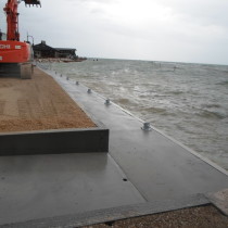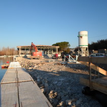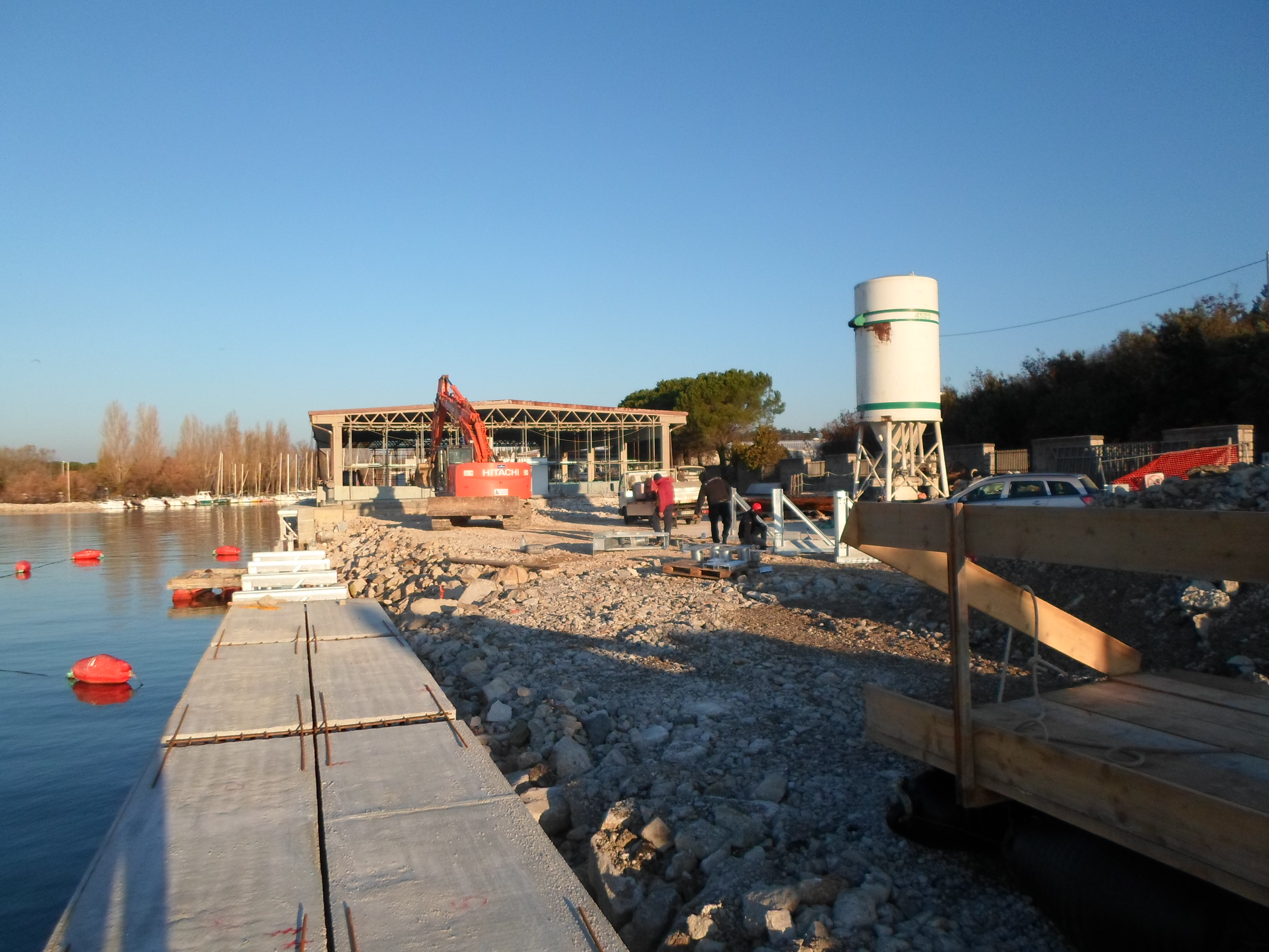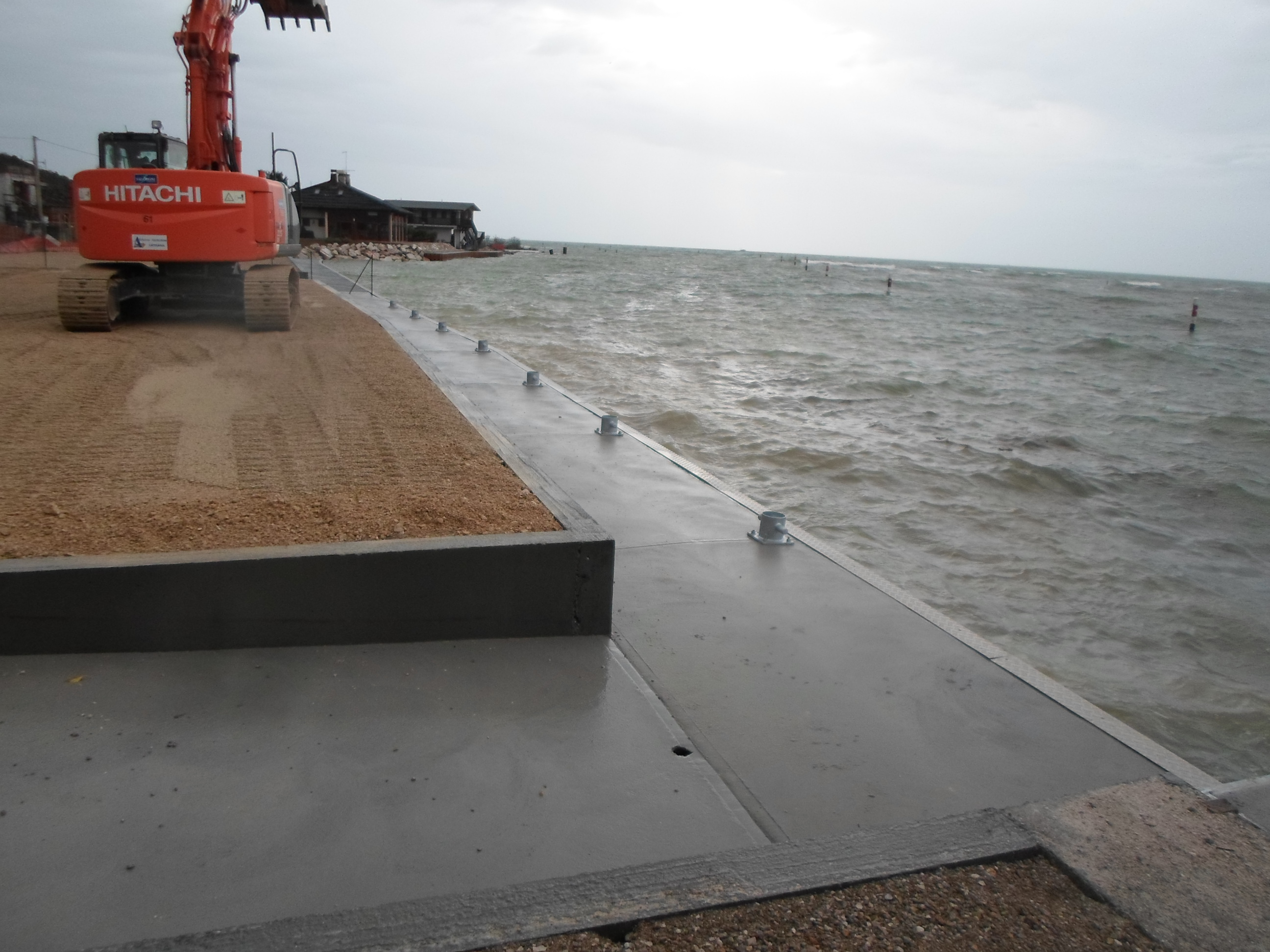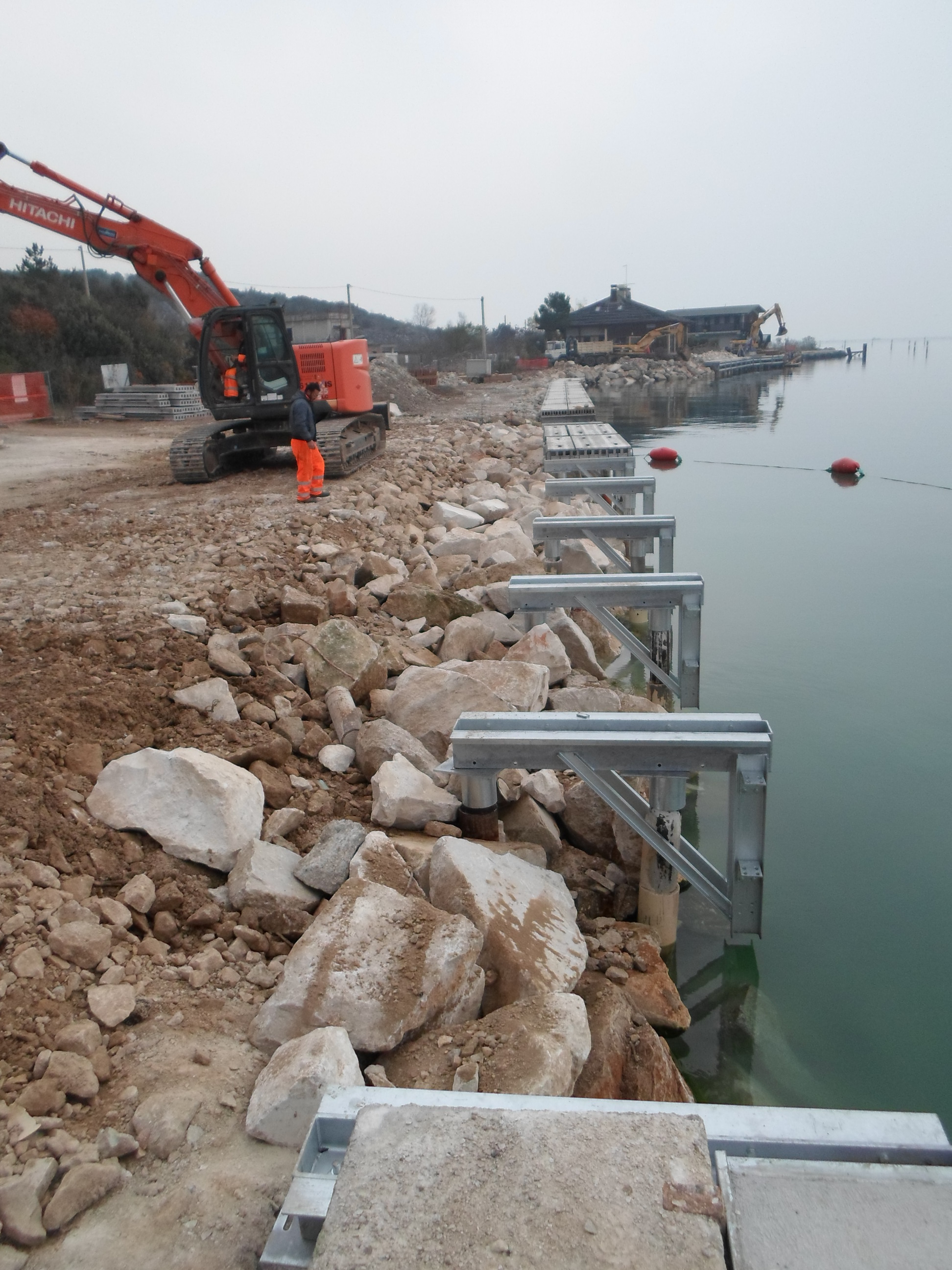 Il progetto prevede la realizzazione di una nuova banchina fronte mare costituita da una serie di coppie di micropali trivellati con armatura in tubo circolare di acciaio, posti in opera ad interassi massimi di 3,85 m, collegati in sommità, a due a due, da telai in acciaio (profili tipo HEB, IPE e UPN) a sostegno di una banchina, larga 2m, in pannelli prefabbricati alveolari autoportanti con getto di completamento in c.a. lavorato a formare la pavimentazione finita antiscivolo.