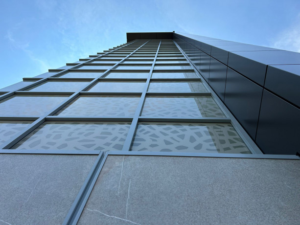 Alla struttura portante principale in cemento armato verrà ancorata una struttura secondaria in acciaio zincato a caldo. Questa struttura secondaria servirà come supporto per la facciata decorativa in pannelli di vetro e per i piani in grigliato metallico.