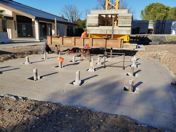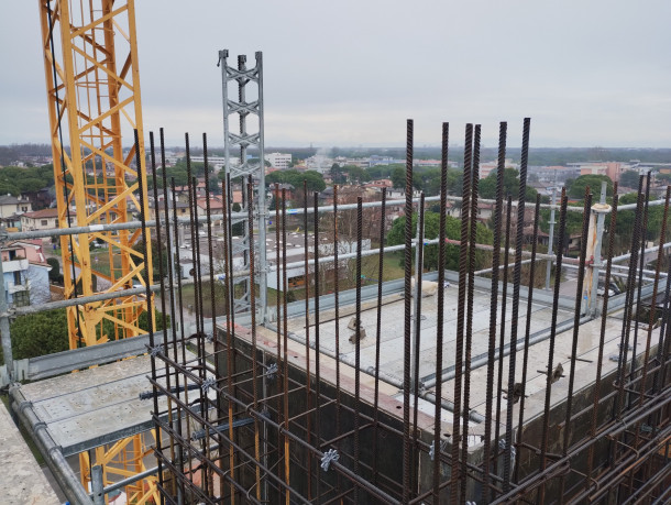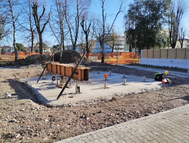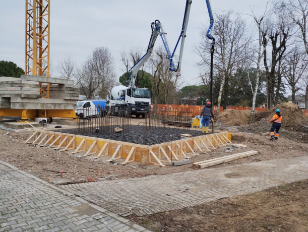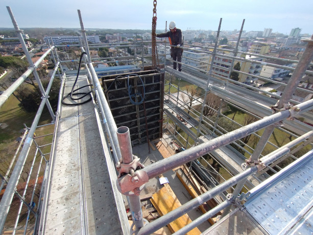 Il progetto prevede la costruzione di un nuovo campanile adiacente alla chiesa esistente di Bibione. La struttura portante principale sarà realizzata in calcestruzzo armato.