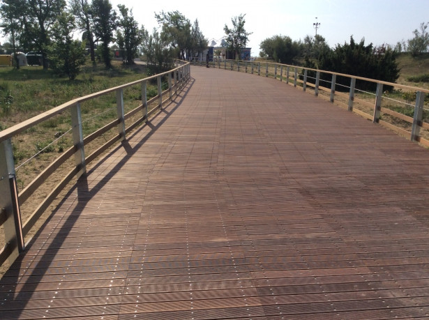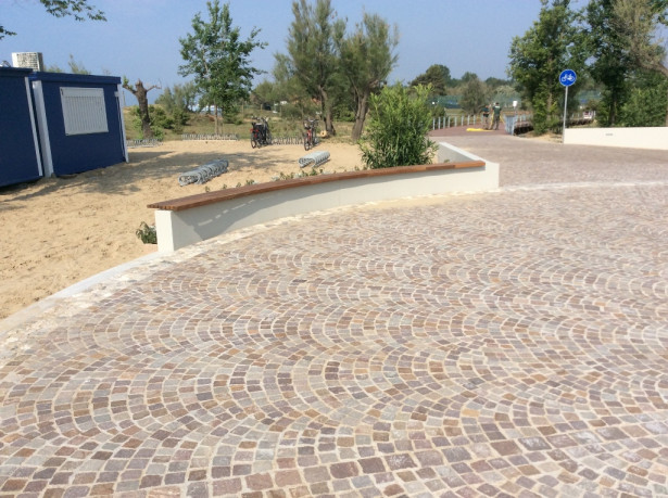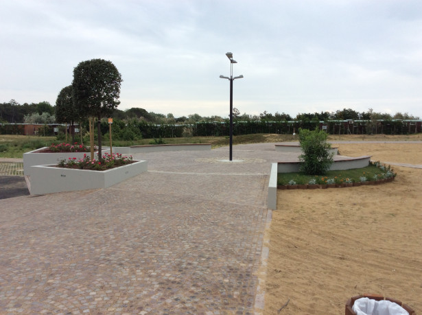 L’opera è particolareggiata dalla rotonda centrale con aiuole e dal tratto di pista realizzata completamente in legno esotico essenza Greenheart e Azobè – la restante pavimentazione è in cubetti di porfido del Trentino.